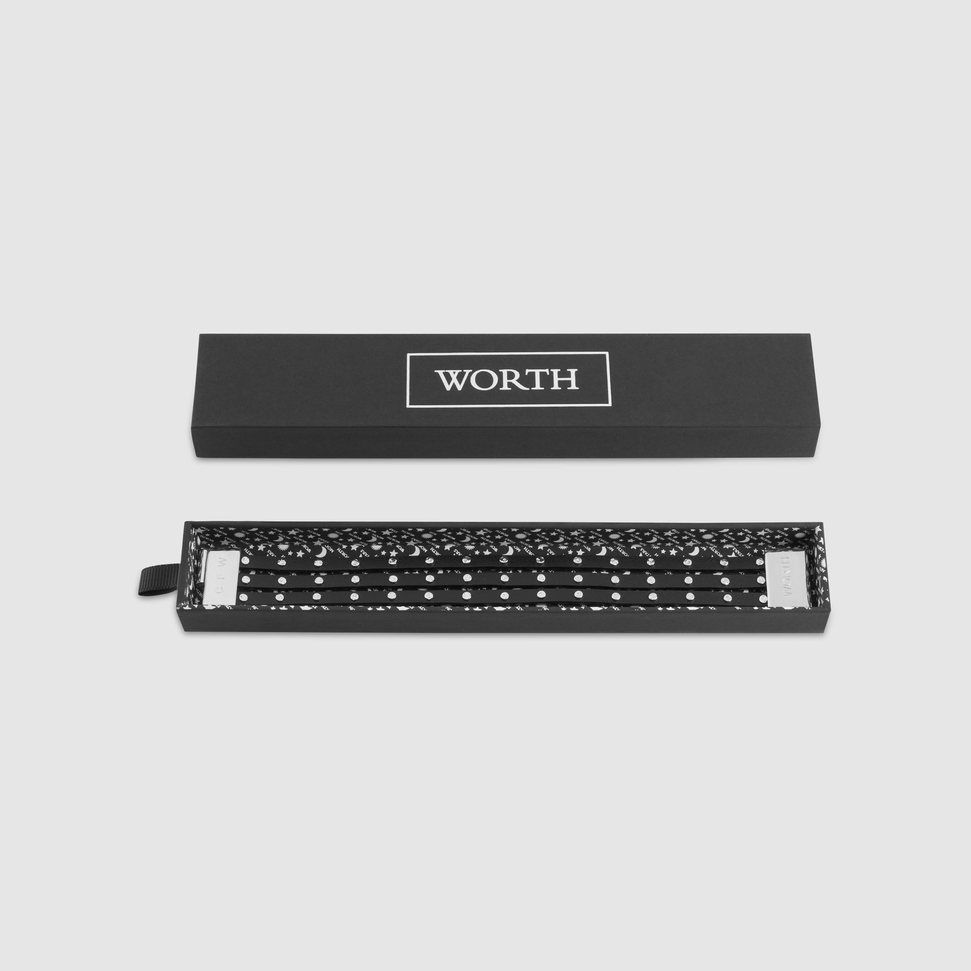素食皮革铆钉三带手链,磁性扣件。月亮和星星雕刻纯银铆钉和扣件。